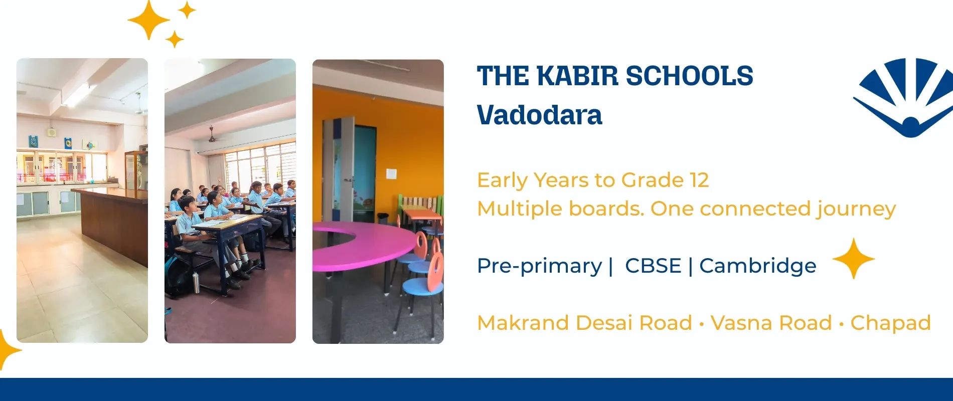 The Kabir Global Academy is the proposed Cambridge school in Vadodara, located at Makrand Desai Road. The Cambridge curriculum is globally recognised and designed to encourage independent thinking, adaptability, and global awareness. The programme will begin with early and primary years and expand gradually.